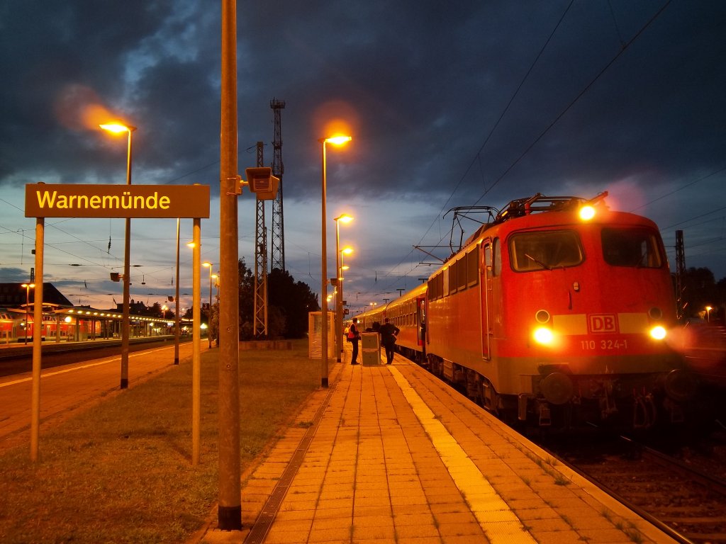 110 324 steht in Warnemünde zur Rückfahrt ins Bw Dalwitzhof bereit. Sie brachte soeben den Bahn-tourist Express von Berlin nach Warnemünde.