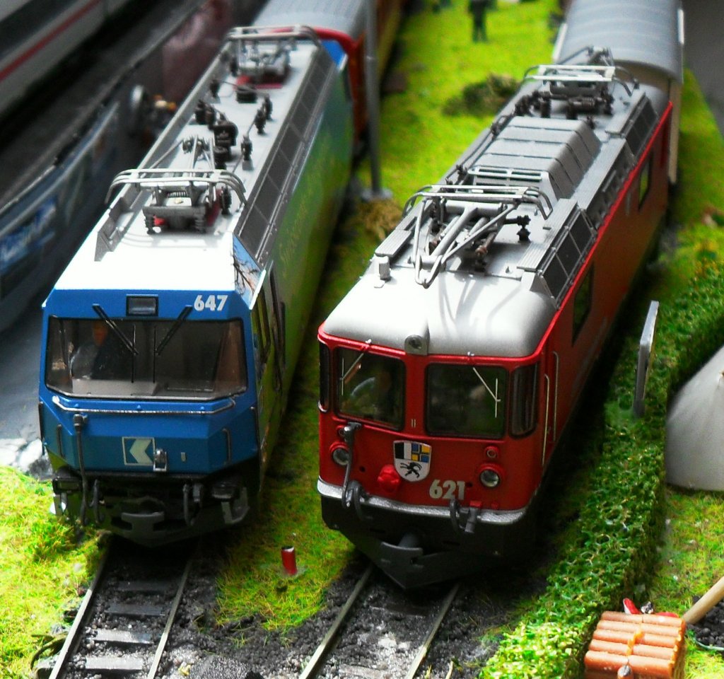 RhB Ge 4/4 III 644 "Savognin" mit Werbung für Radio e Televisiun Rumantscha und einem Glacierexpress am 13. August 2010 in Versam-Safien.