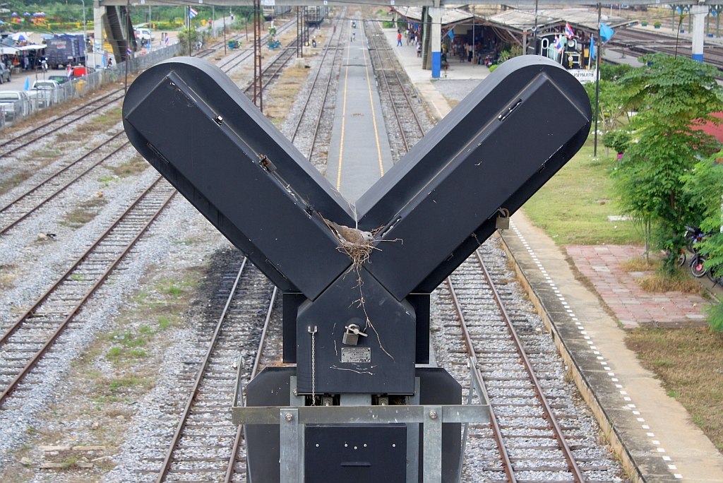 Die Tierwelt weiss die Form der Lichtsignale zu schätzten. Nistende Taube an der Rückseite eines Ausfahsignales im Bf. Ban Phachi am 24.August 2010.