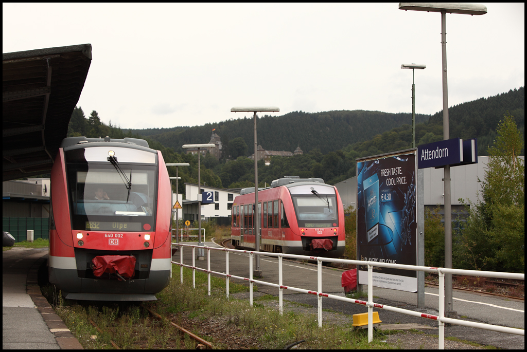640 018 verlässt als RB92 Attendorn in Richtung Finnentrop. 640 002 wird gleich seine Fahrt nach Olpe vortsetzen. Im Hintergrund die Burg Schnellenberg. (29.08.2010)