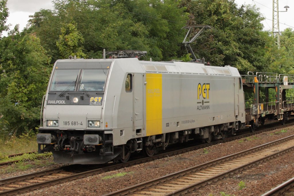 Mit einem Ganzzug leerer Autotransportwagen fährt 185 681-4 (Railpool/ PCT Altmann) durch Magdeburg-Buckau in Richtung Schönebeck. Fotografiert am 30.08.2010.