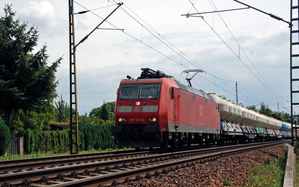 185 146 zieht am 30.07.10 einen tschechischen Zementzug durch Dresden-Stetzsch Richtung Priestewitz.