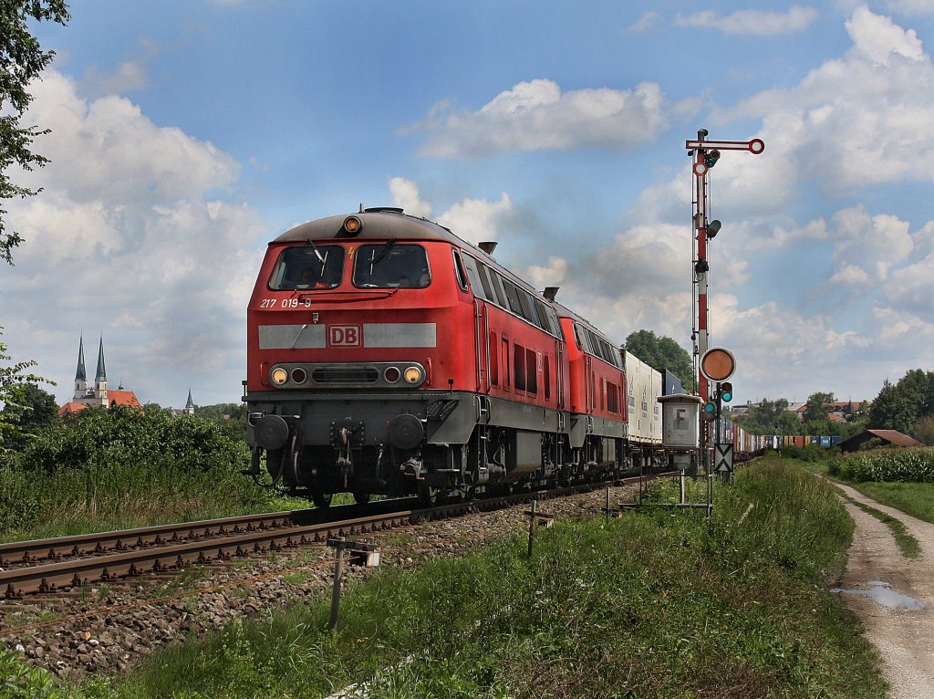 Die 217 019 und die 217 012 am 09.08.2010 mit dem Wacker Shuttle unterwegs bei Altötting.