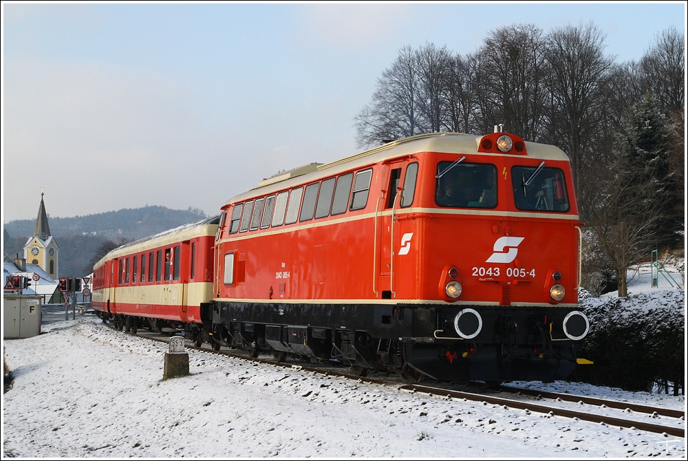 2043 005 mit Schlieren bei der Abschiedfahrt auf der Donauuferbahn von Linz nach Spitz.