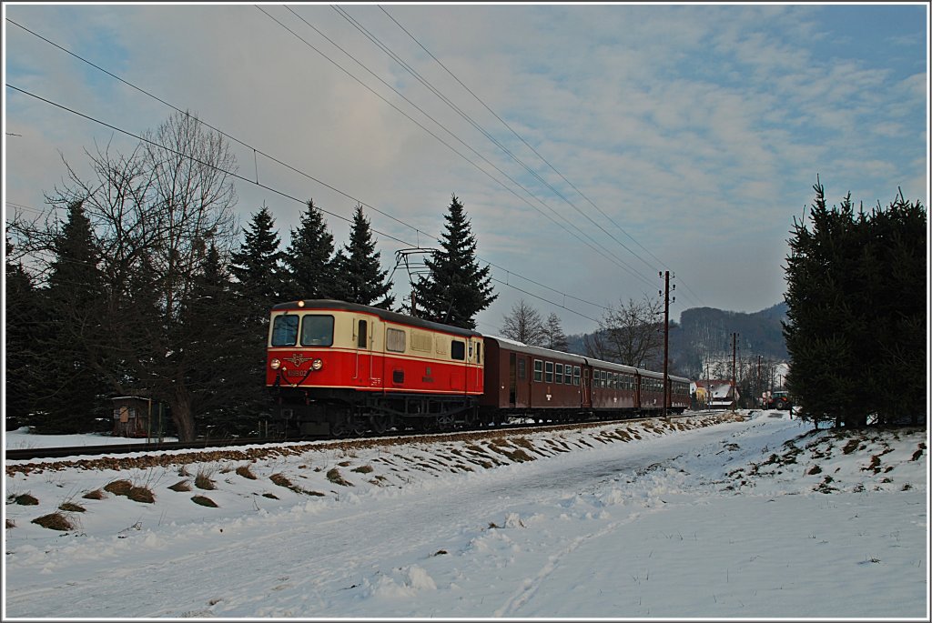 Auch der R 6813 wurde von einer 1099 bespannt, am 30.11.2010 war es die 1099.002 die eine reine braune Garnitur durch das verschneite Pielachtal zog. (Kirchberg)