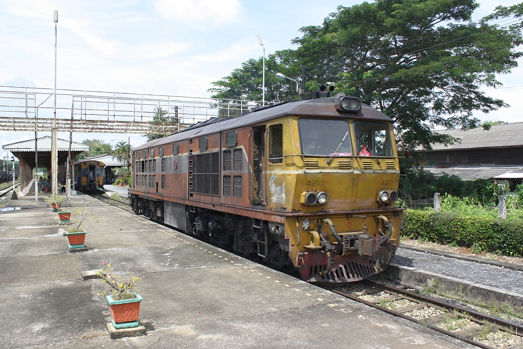 Die AHK 4210 (Co'Co', de, Krupp, Bj.1980, Fab.Nr. K-5479) umfährt am 27.Oktober 2010 in der Khao Chum Thong Junction den ORD 455 (Nakhon Si Thammarat - Yala). Rechts im Bild das Gleis in Richtung Hat Yai, hinter der Lok erkennt man die Abzweigung nach Nakhon Si Thammarat.