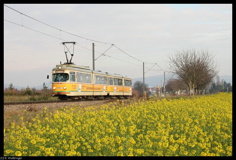 Triebwagen 1017 mit dem Beiwagen 1057 fährt am 28. November 2010 gemächlich von Heddesheim nach Wallstadt.