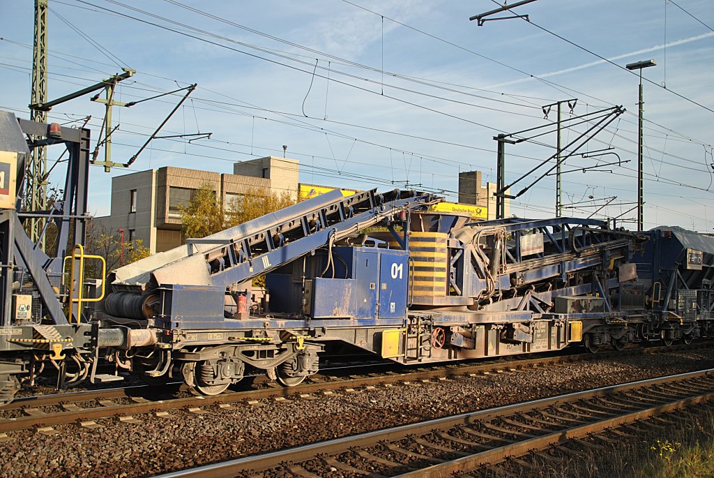 Wagen mit Förderband für Schotter, in einen Bauzug am 29.10.2010.