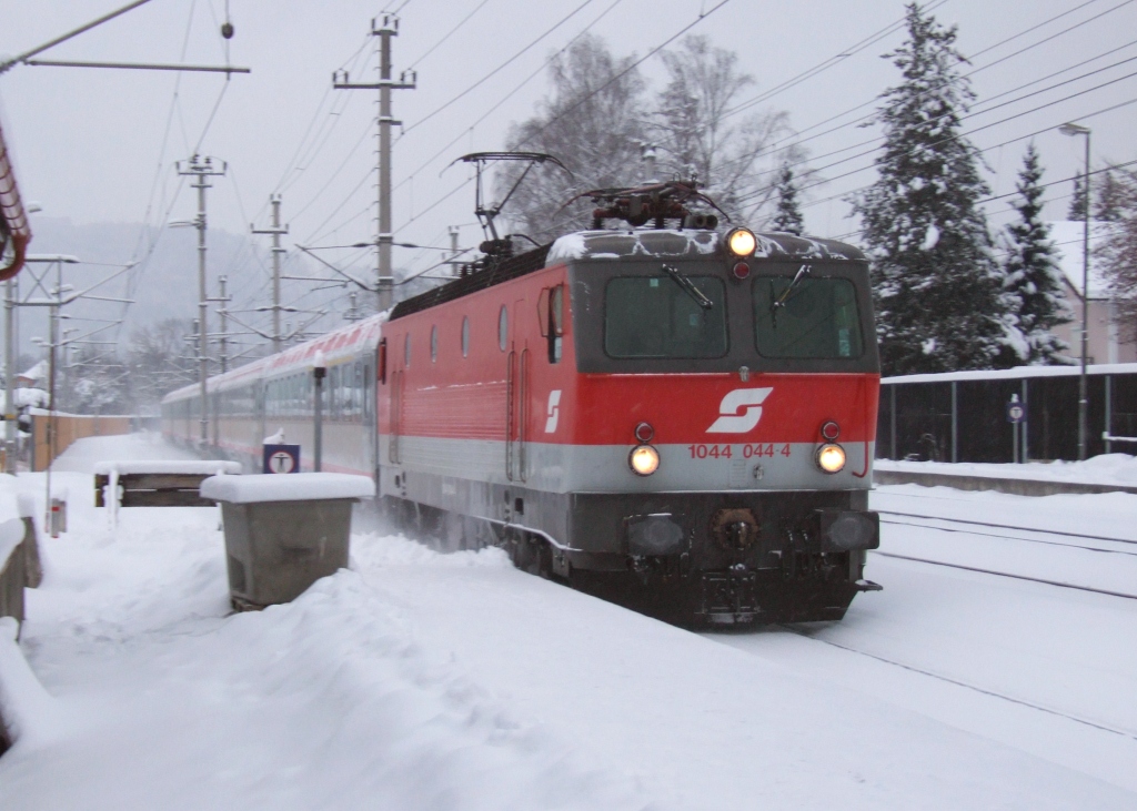 1044 044, eine der letzten mit der alten Bildmarke […im März ’11 durch die Wortmarke ersetzt], am IC 513 Salzburg–Graz in Salzburg Aigen. [15.12.10, 08:26]