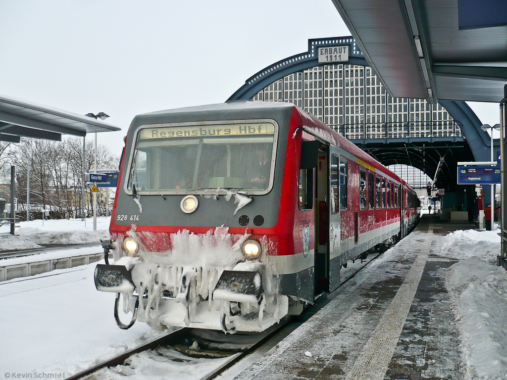 Als Ersatz für ein 612er-Gespann kommt hier eine Doppeltraktion VT 628 als RE Gera Hbf - Regensburg Hbf zum Einsatz. Der Zug steht abfahrbereit am Gleis 4a in Gera Hbf. (10.12.2010)