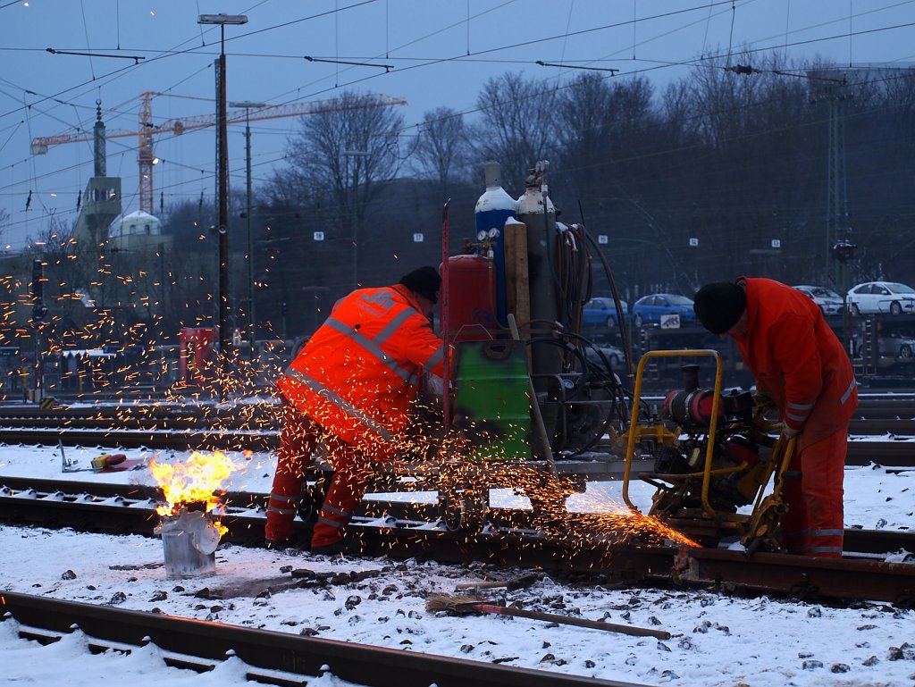 Schweißeinsatz in Aachen West am 14.12.2010. Nach dem Verschweißen der Schiene mit der Thermit-Technik wird hier mit dem letzten Schliff die Schweißnaht geglättet, die Nahtstelle glüht noch dunkelrot nach. Anschließend wird das Werkzeug auf den Wagen geladen und weiter gehts zum nächsten Schweißeinsatz. Dieses zweiköpfige Team schweißt und schleift die Schienenenden, ein dritter wärmt die Schienen mit einem Wagen mit Gasbrennern vor um sie zu längen.