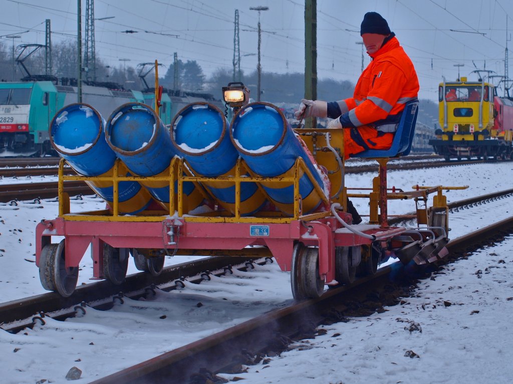 Vorbereitungen für den nächsten Schweißeinsatz am 14.12.2010 in Aachen West. Mit diesem Wagen wird die Schiene mit Gasbrennern bei den kalten Temperaturen angewärmt um sie zu längen. Bei den zur Zeit herrschenden minus 6°C zieht sich die Schiene zusammen. Würde man die Schienen jetzt ohne vorwärmen zusammenschweißen, lägen sie im Sommer wenn sich der Stahl ausdehnt in Wellen auf den Schwellen. Der Job ist im Winter nichts für Weicheier, man sitzt auf dem Wagen, fährt langsam hin und her, von unten heizt der Gasbrenner und oben rum ist man schutzlos der Kälte und dem Wind ausgesetzt.