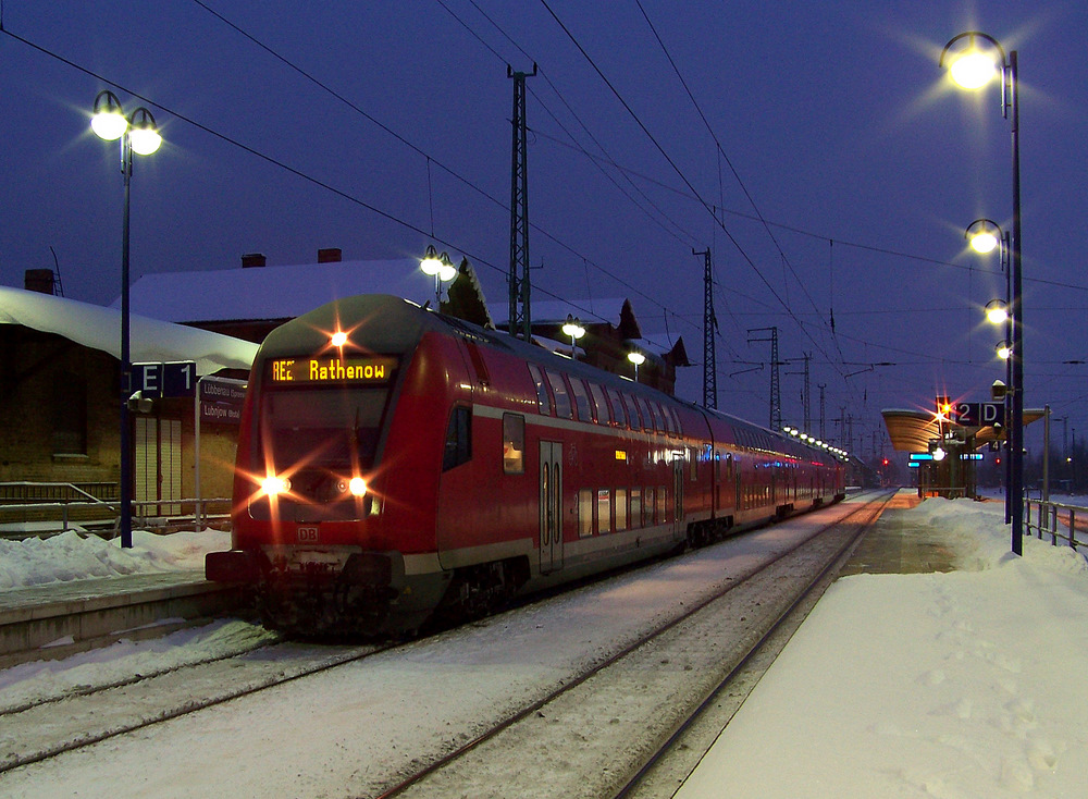 (Winterrückblick 2009/10) Am 14.01.2010 kommt hier der RE2 von Cottbus nach Rathenow mit Steuerwagen voraus. Er steht in Lübbenau/Spreewald zur ABfahrt bereit.