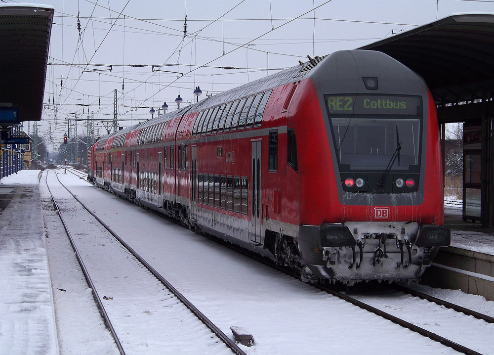 (Winterrückblick 2009/10) Am Neujahrstag des Jahre 2010 konnten man diese Garnitur des RE2 nach Cottbus wartend in Lübbenau sichten.