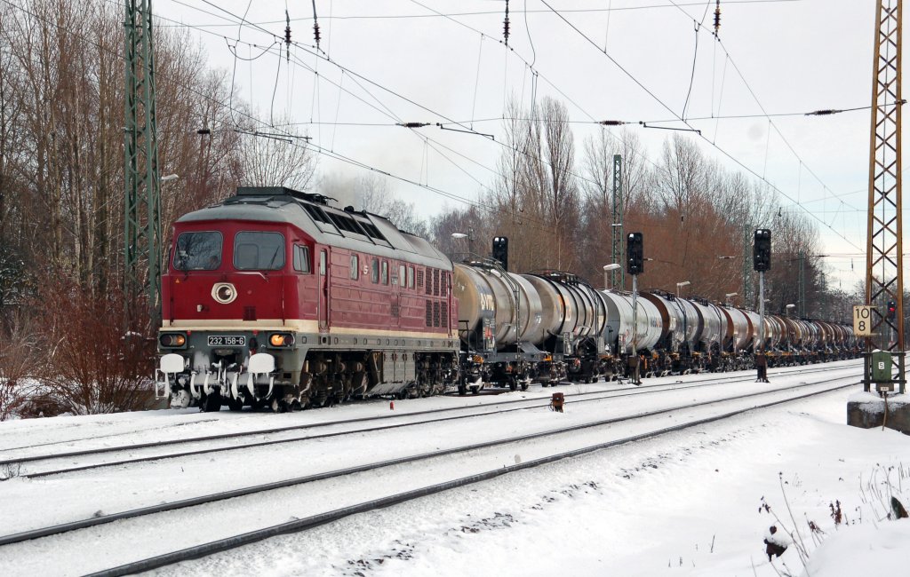 232 158 der LEG beschleunigt am 10.12.10 in Leipzig-Thekla und zieht ihren Zug Richtung Mockau.