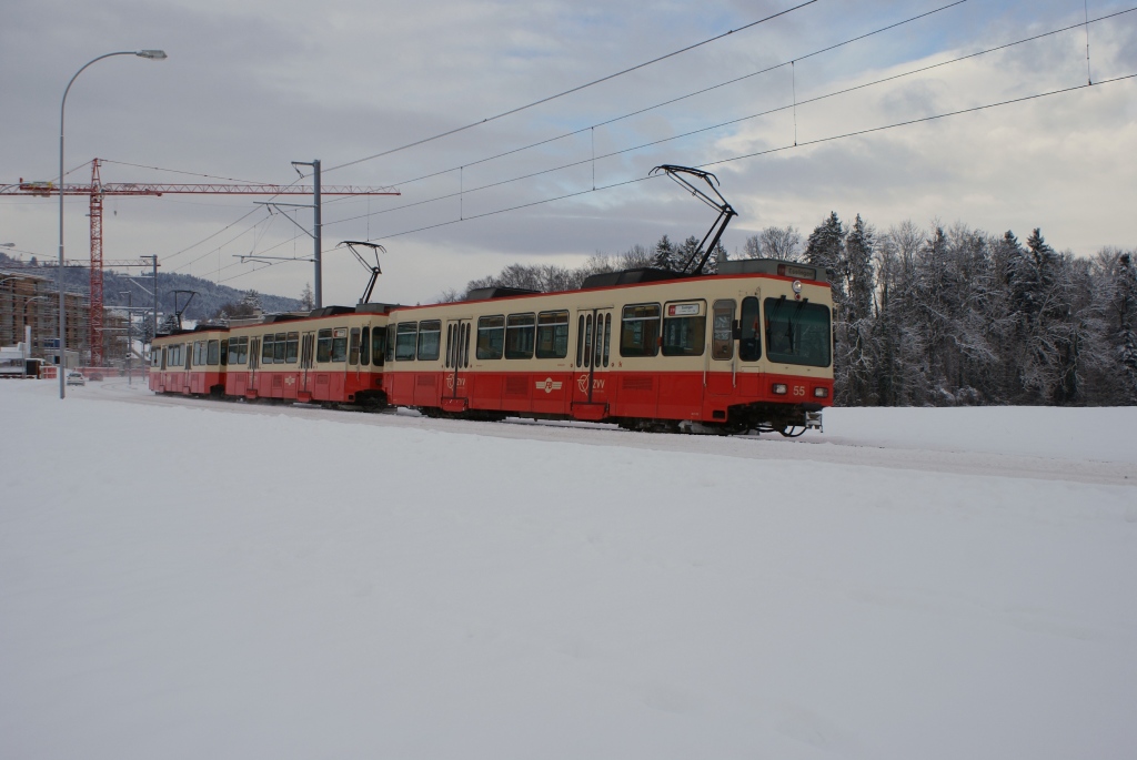 Be 4/4 55 nähert sich am 18.12.10 gemeinsam mit dem Be 4/4 58 und dem Be 4/4 57 der Station Emmat.