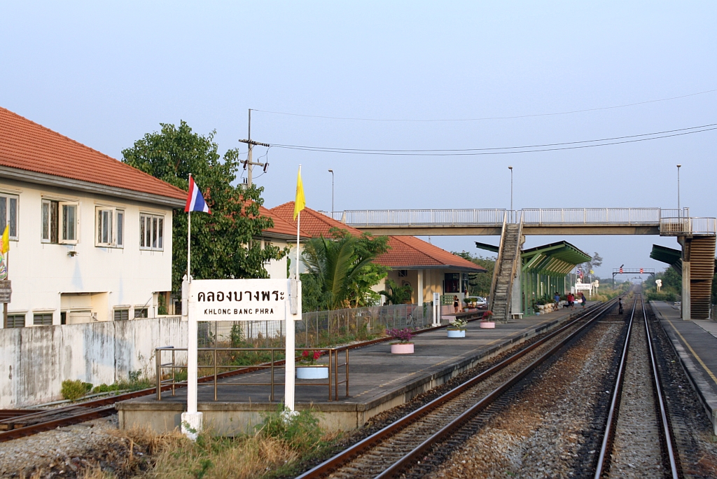 Auch wenn links des Zuges ein Bahnsteig ist, in diese Richtung möchte man ja nicht; Bf. Khlong Bang Phra am 27.Oktober 2010.