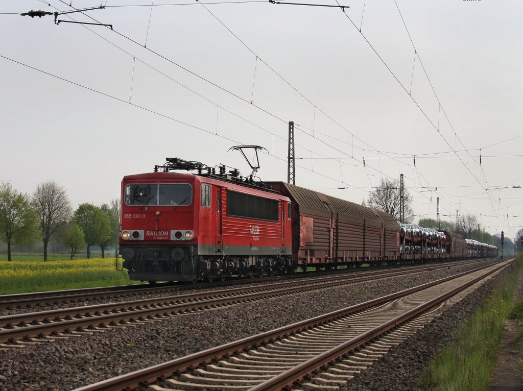 Die 155 081 am 28.04.2010 mit einem Autozug unterwegs bei Dörverden.