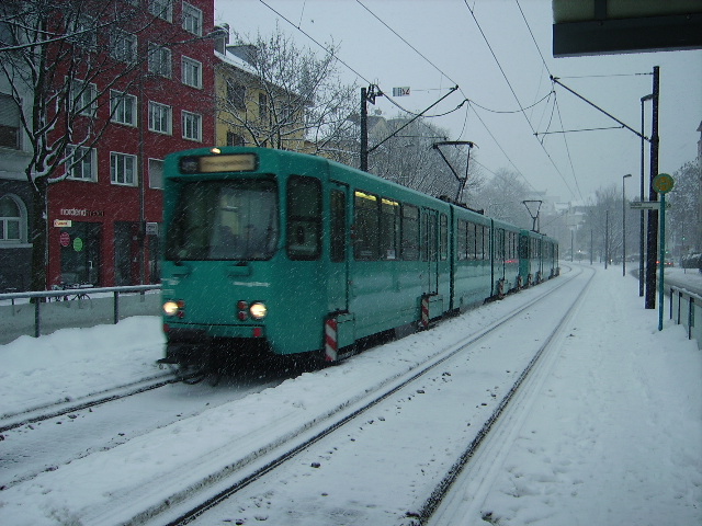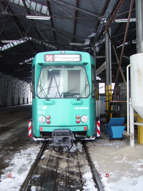 Ein PTB Wagen der VGF in Eckenheim abgestellt am 19.12.10. Das Foto wurde nicht auf Betriebsgelände gemacht. Die Halle ist offen und ich habe heran gesoomt.