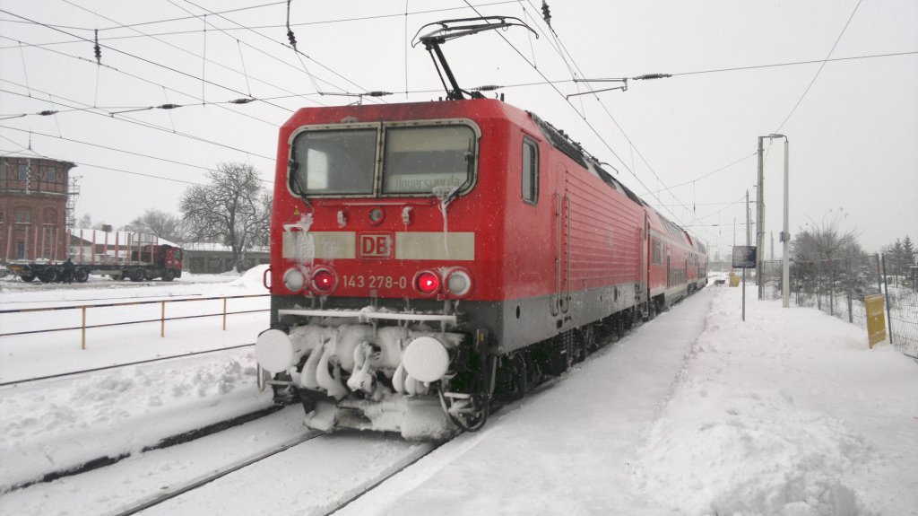 Hier 143 233-5 mit einem RE7 von Berlin Friedrichstraße nach Bad Belzig, dieser Zug stand am 19.12.2010 in Bad Belzig.