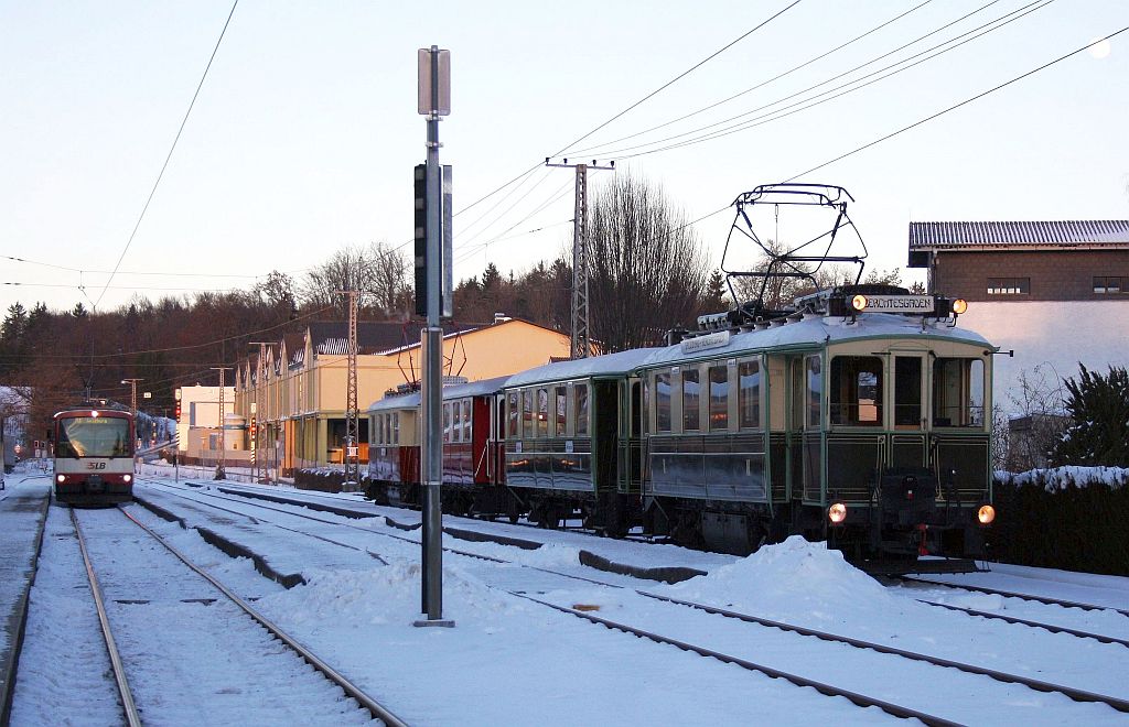 Jährlich bietet die Salzburger Lokalbahn Advent Nostalgiefahrten durch den Flachgau nach Lamprechtshausen und zum Stille Nacht Ort Oberndorf an. Hier die Rote Elektrische am 19. Dezember 2010 zwischen Muntigl und Siggerwiesen.