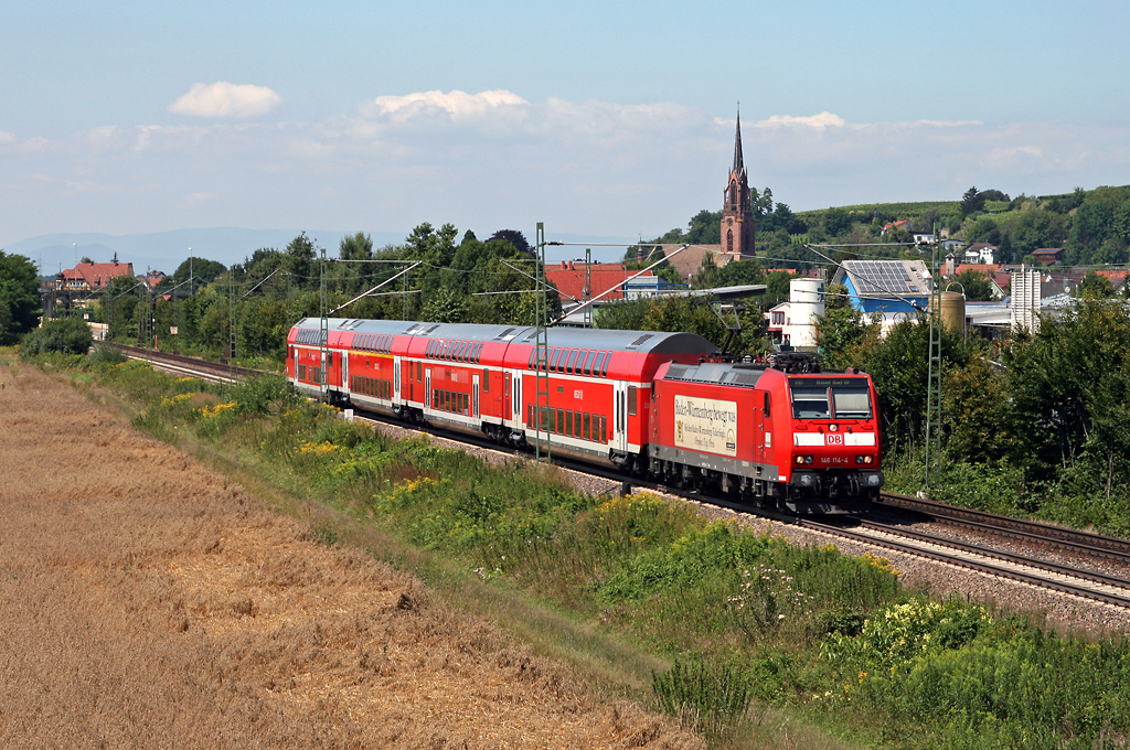 Bei Teningen befördert die Freiburger 146 114 am 07. August 2010 den RE 31019 von Offenburg nach Basel in Richtung Süden.