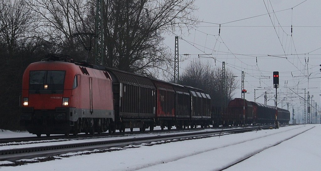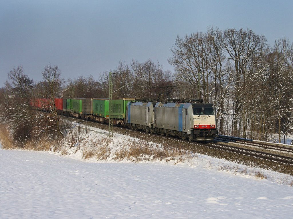 Die 186 101 und eine Weitere am 04.12.2010 mit dem Hangartner KLV-Zug unterwegs bei Hilperting.