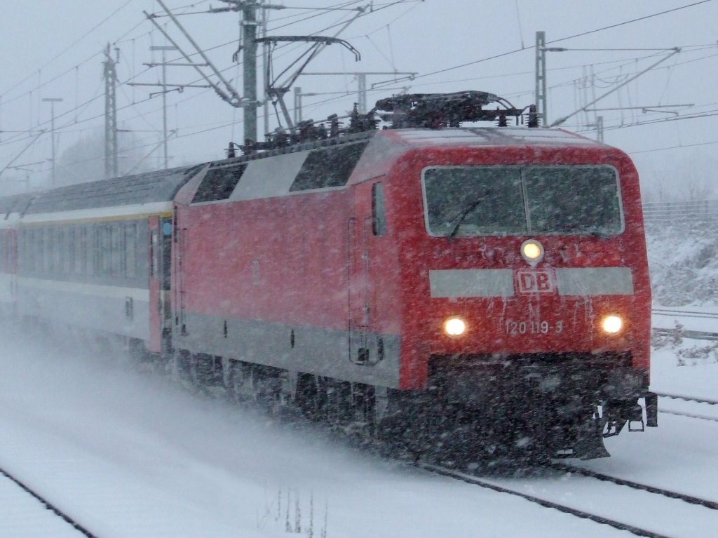 120 119 durchfährt am 24.12.2010 bei heftigen Schneetreiben den Bahnhof Herrenberg in Richtung Stuttgart Hbf.