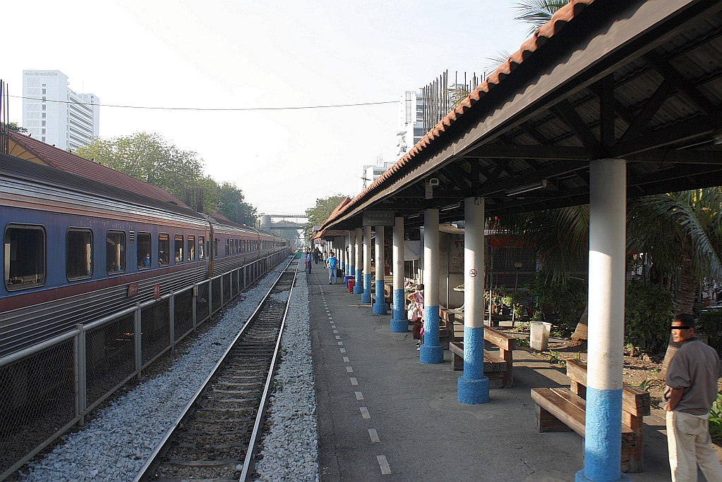Ausfahrtsbereich des Bf. Hua Lamphong am 05.Dezember 2010. Mit Ausnahme des Fotographen herrscht hier Alltag. Man nimmt die Bezeichnung "öffentliche Verkehrsmittel" halt wörtlich.