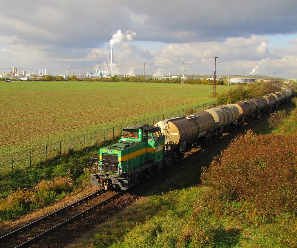 IL 183 (98 80 0264 007-2 D-LEUNA) mit einer Kesselwagenübergabe aus den Leuna Werken, auf dem Anschlussgleis in Großkorbetha Rbf; 25.10.2010