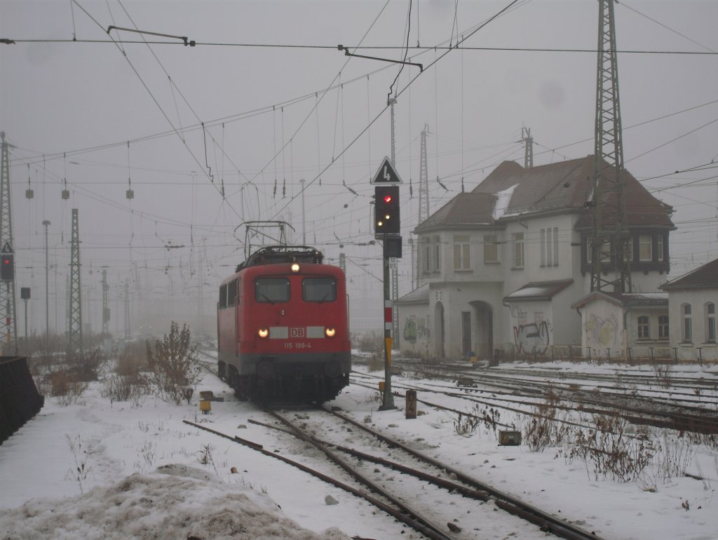 Noch ne andere Perspektive der 115 198 mit dem stillgelegten Stellwerk B2 und dichtem Nebel im Gleisvorfeld des Leipziger Hbf's.