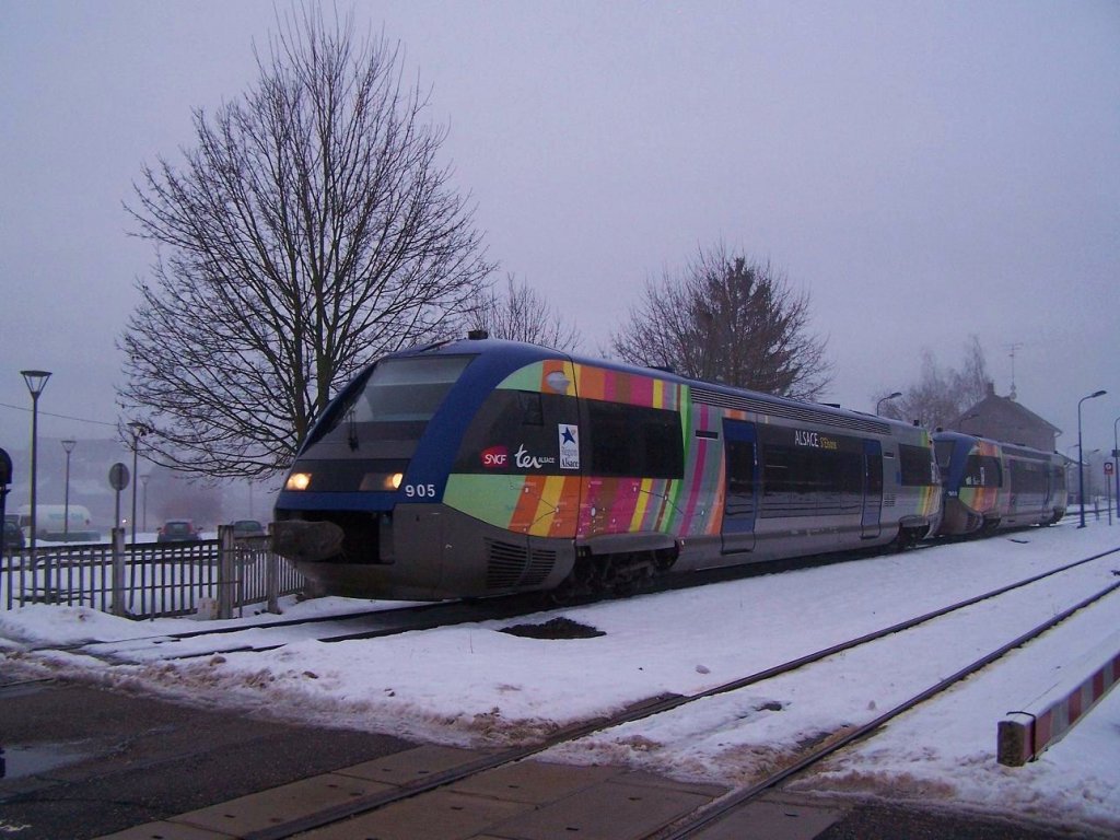 Triebwagen X 73905 im Bahnhof Oermingen am 21/12/10, mit einem Zug nach Strassburg.