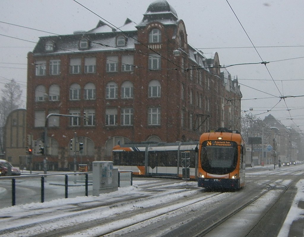 Variobahn 4147 als Linie 24 nach Rohrbach Süd am Verschneiten Betriebshof in Heidelberg am 24.12.2010