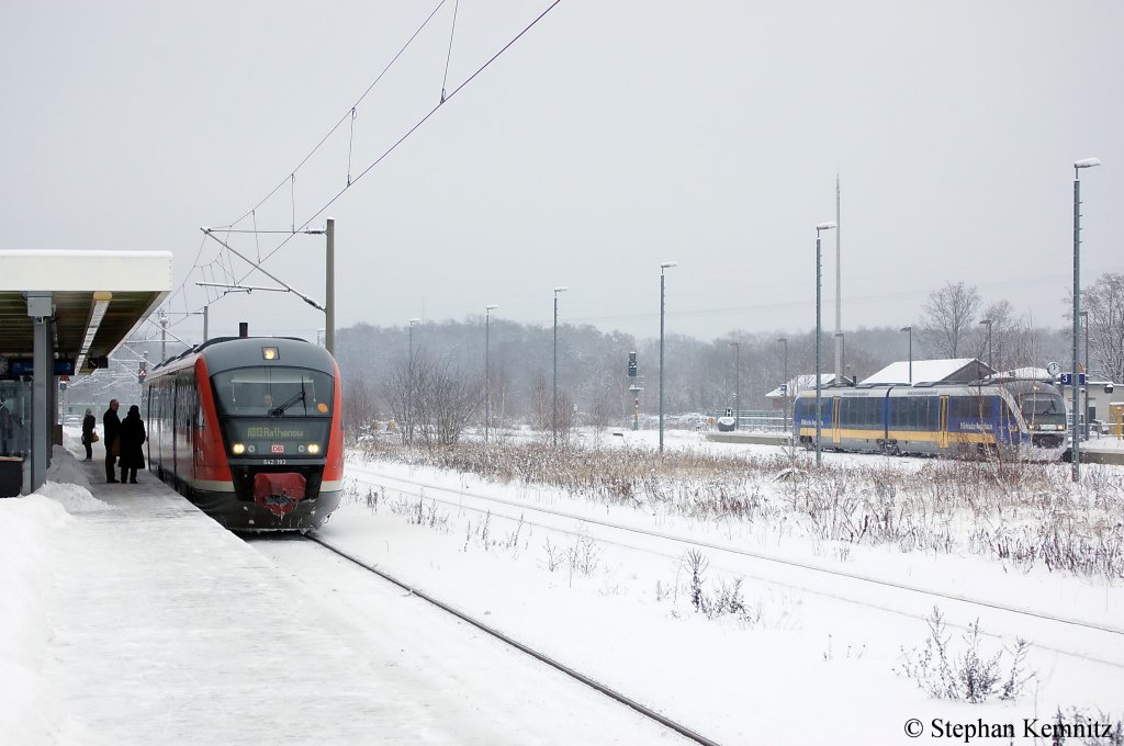 In Rathenow ein kleines 642er Desiro treffen. Auf Gleis 2 steht die 642 193/693 der DB als RB13 (RB 17962) nach Stendal. Auf Gleis 3 steht die VT 565 von der Märkischen Regiobahn als MR51 (MR 68929) nach Brandenburg. 28.12.2010