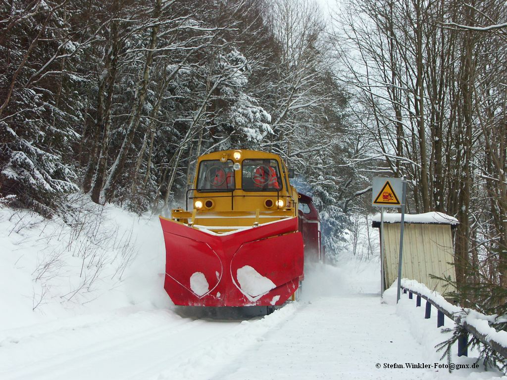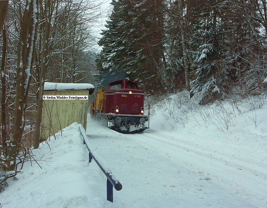 Südbayerische Hilfe beim Schneeräumdienst in Oberfranken, aufgenommen am 28.12.2010 im HP Oberklingensporn an der Strecke Hof - Bad Steben. Da der eigentlich vorgesehene Pflug während einer Räumung kaputt ging, kam der Ersatzpflug aus Holzkirchen und wurde von der BOB V 126 geschoben. DB-V 100 auf der oberfränkischen Nebenbahn - wie in alten Zeiten! Mittlerweile ist dieser kleine Haltepunkt vollends aufgegeben, damals hielten wenigstens noch 2 Züge dort...