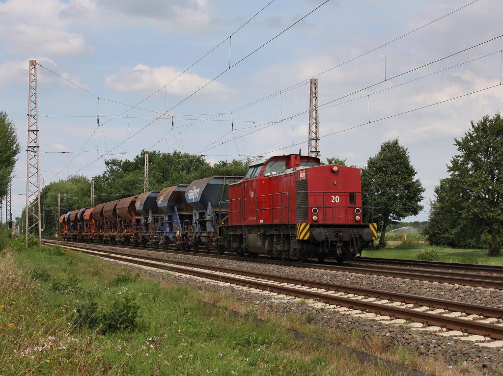 Die 203 122 am 11.08.2010 mit einem Schotterzug unterwegs bei Dörverden.