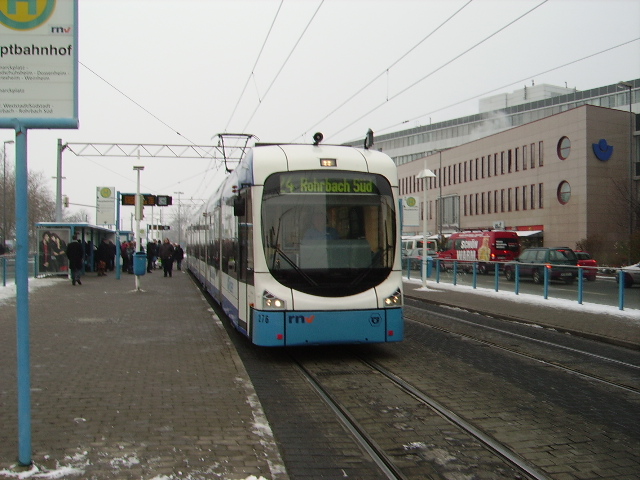 Eine blaue RNV Straßenbahn in Heidelberg Hbf am 03.12.10