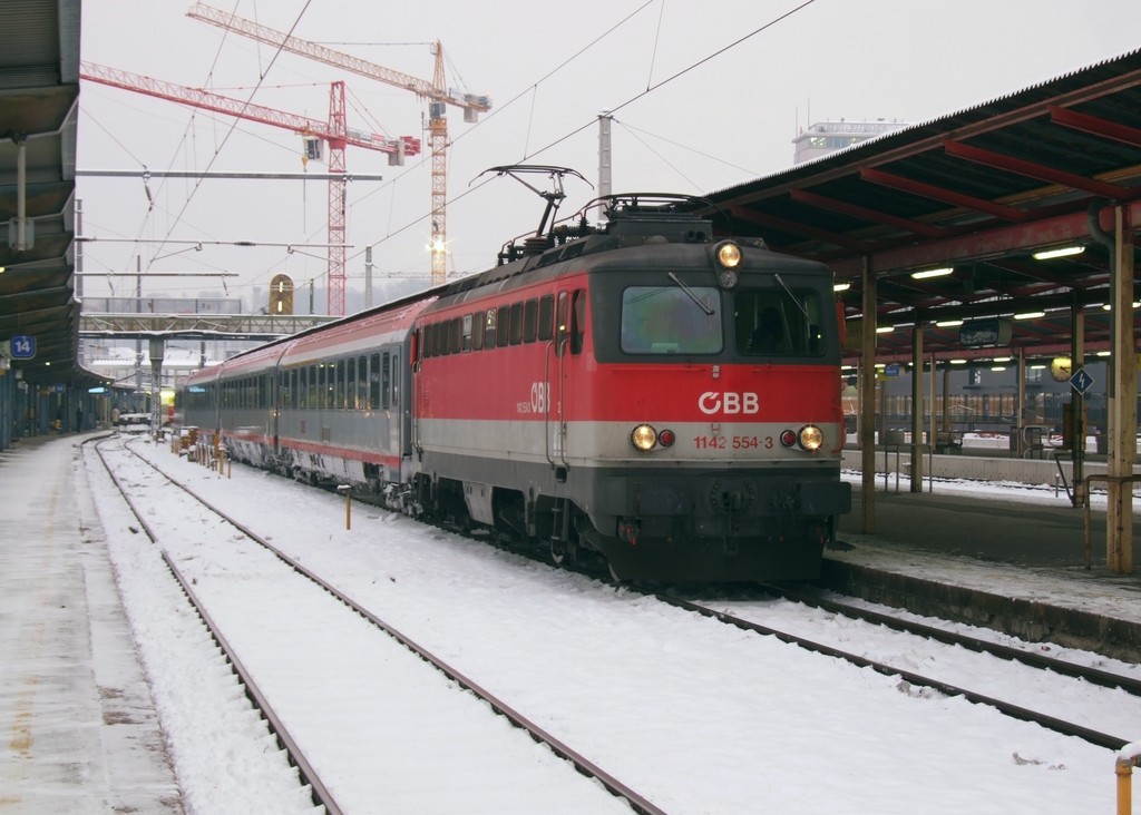 Nicht nur auf der Südbahn kann man - selten aber doch - 1142er in 1x44er-Fernverkehrs-Planleistungen antreffen: Hier bespannt die vierzig Jahre alte 1142 554 den IC 611 Salzburg - Graz, kurz vor der Abfahrt auf Bstg 13 im Hbf Salzburg. [03.12.2010]
