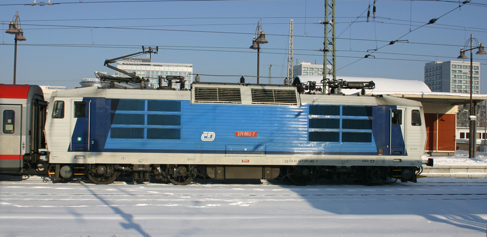 Das Schneechaos hat die übliche Gleisbelegung in Dresden Hbf kräftig durcheinander gewirbelt. Hier ist 371 002-7 mit einem EC in Richtung Prag auf Gleis 3 (statt Gleis 1) am 02.12.2010 zu sehen.