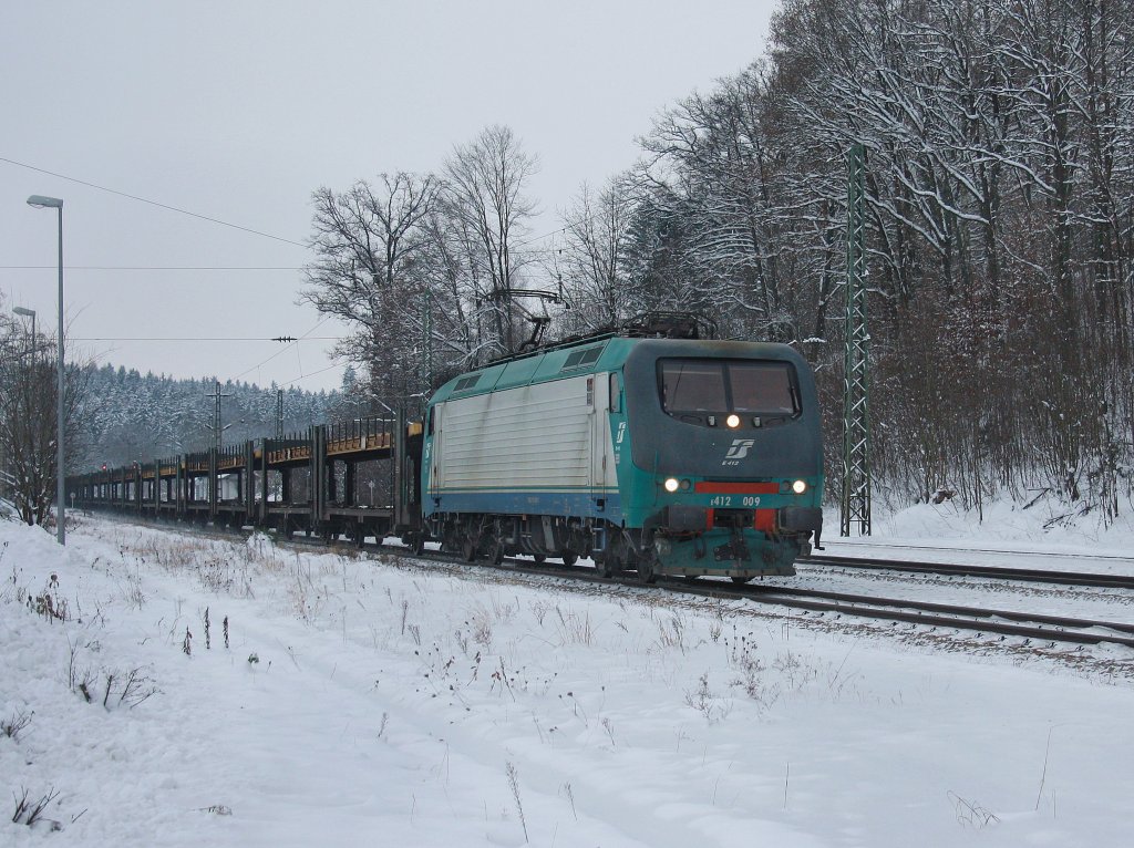 Die E 412 009 am 04.12.2010 mit einem Leeren Autozug bei der Durchfahrt in Aßling.