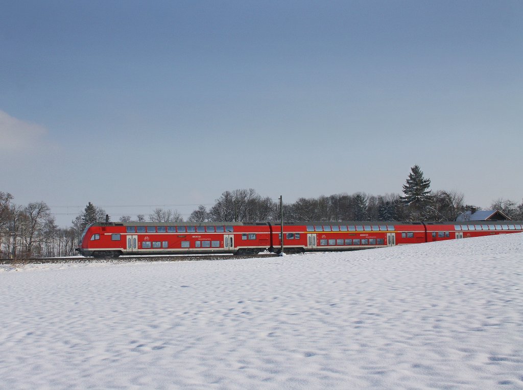 Einen RE nach Mühldorf in Sandwich-Traktion hatte am 04.12.10 die 218 401-8 am Haken. Als Schublok unterstützte sie 218 418-2 auf dem Weg nach Mühldorf in Poing.