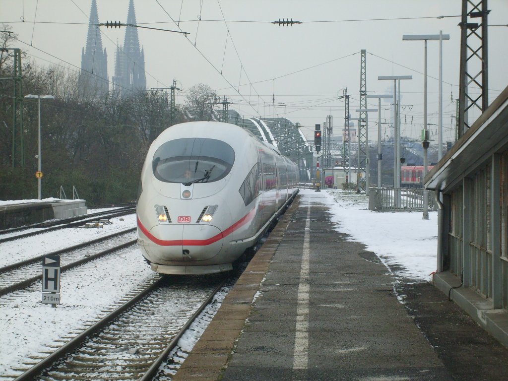 Hier durchfährt gerade ein ICE3 am 3.12. den Bahnhof Köln Messe/Deutz auf Gleis 4.
