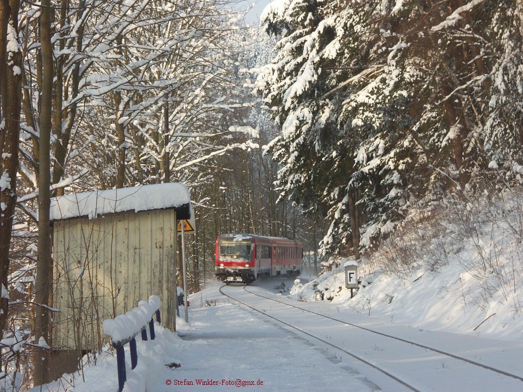 KBS 857, Haltepunkt Oberklingensporn, am 2.12.2010. Ein 628.4 fährt langsam durch um in ca 2,5 Kilometern am Bf. Naila anzukommen auf seiner Fahrt nach Hof. So ist er, der Frankenwald-Winter. Und ca 50 Meter hinter dem Zug fuhr 2008 ein 628 in einen umgestürzten Baum. Das löste den letzten mir bekannten 218er Einsatz auf dieser Strecke aus....