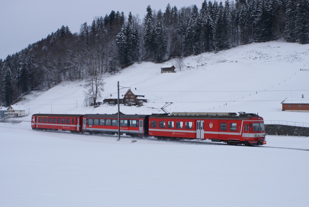 Wenig später wurde ich vom historischen Triebwagen BCe 4/4 30 überrascht, welcher eine Hochzeitgesellschaft transportierte. Das Bild entstand am 27.11.10 bei Jakobsbad.