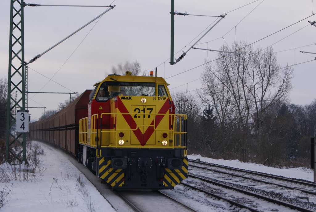 Mak 1206 der MEG (Lok 217) mit Kohlependel Richtung Großkorbetha fahrend,im ehemaligen HP Schkortleben (nur Strecke Großkorbetha-Deuben)erkennbar an der fehlenden Oberleitung über diesem Gleis.am 06.12.2010
