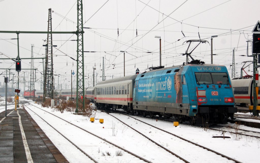 101 016 schiebt am 07.12.10 zusammen mit einer weiteren BR 101 den IC 2870 aus dem Leipziger Hbf Richtung Frankfurt(M).