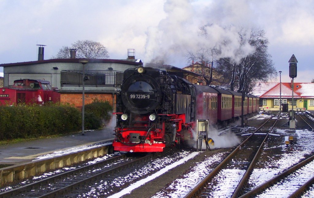 Am 24.11.2010 stand die HSB 99 7239-9 mit der HSB 8935 zum Brocken abfahrbereit in Wernigerode.