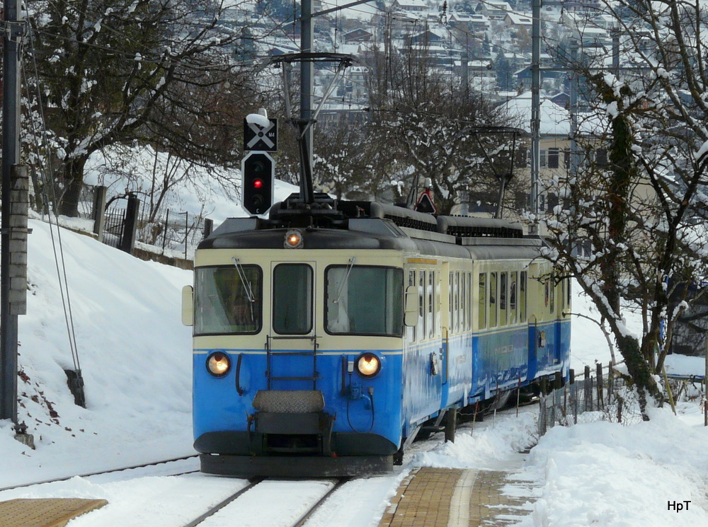 MOB - Triebwagen BDe 4/4 3006 zusammen mit dem BDe 4/4 3005 bei der ausfahrt aus dem Bahnhof von Chernex am 03.12.2010