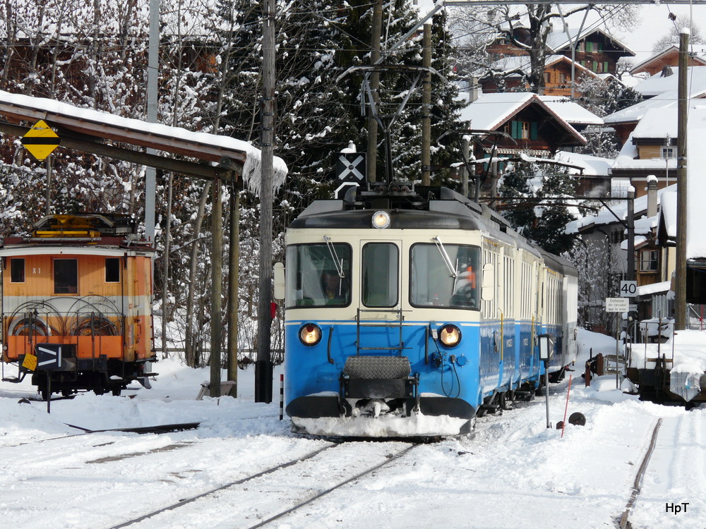 MOB - Triebwagen ABDe 8/8 4002 vor Regio bei der einfahrt in den Bahnhof von Chateau D`Oex am 03.12.2010