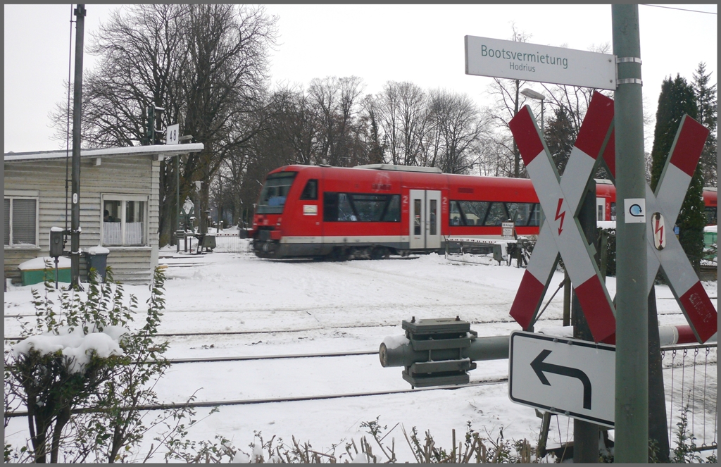 Schrankenposten 48 am Ende des Bodenseedammes in Lindau mit ausfahrendem 650 nach Friedrichshafen. (02.12.2010)